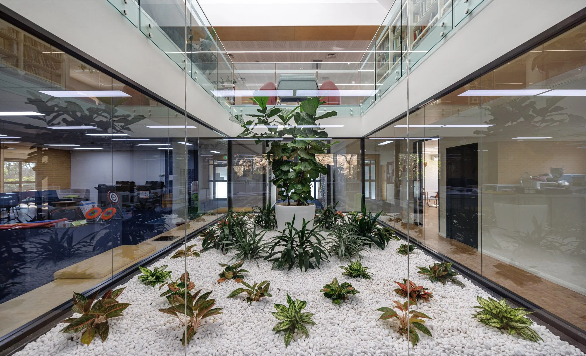 A plant-filled atrium is located in the centre of the library, with flexible, open-plan learning areas arranged around it. A senior study area, seminar rooms and an IT help desk are also located within the library space.