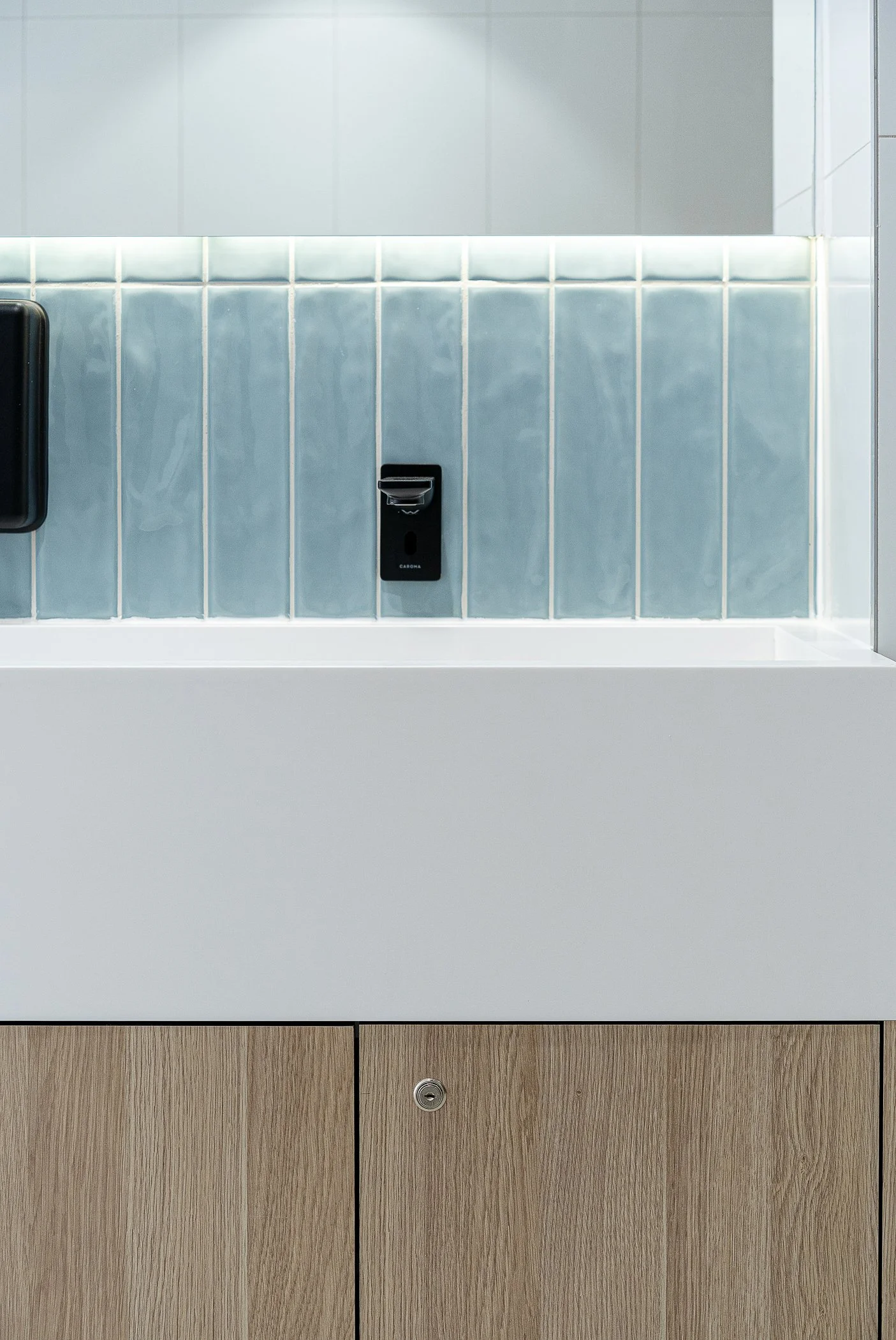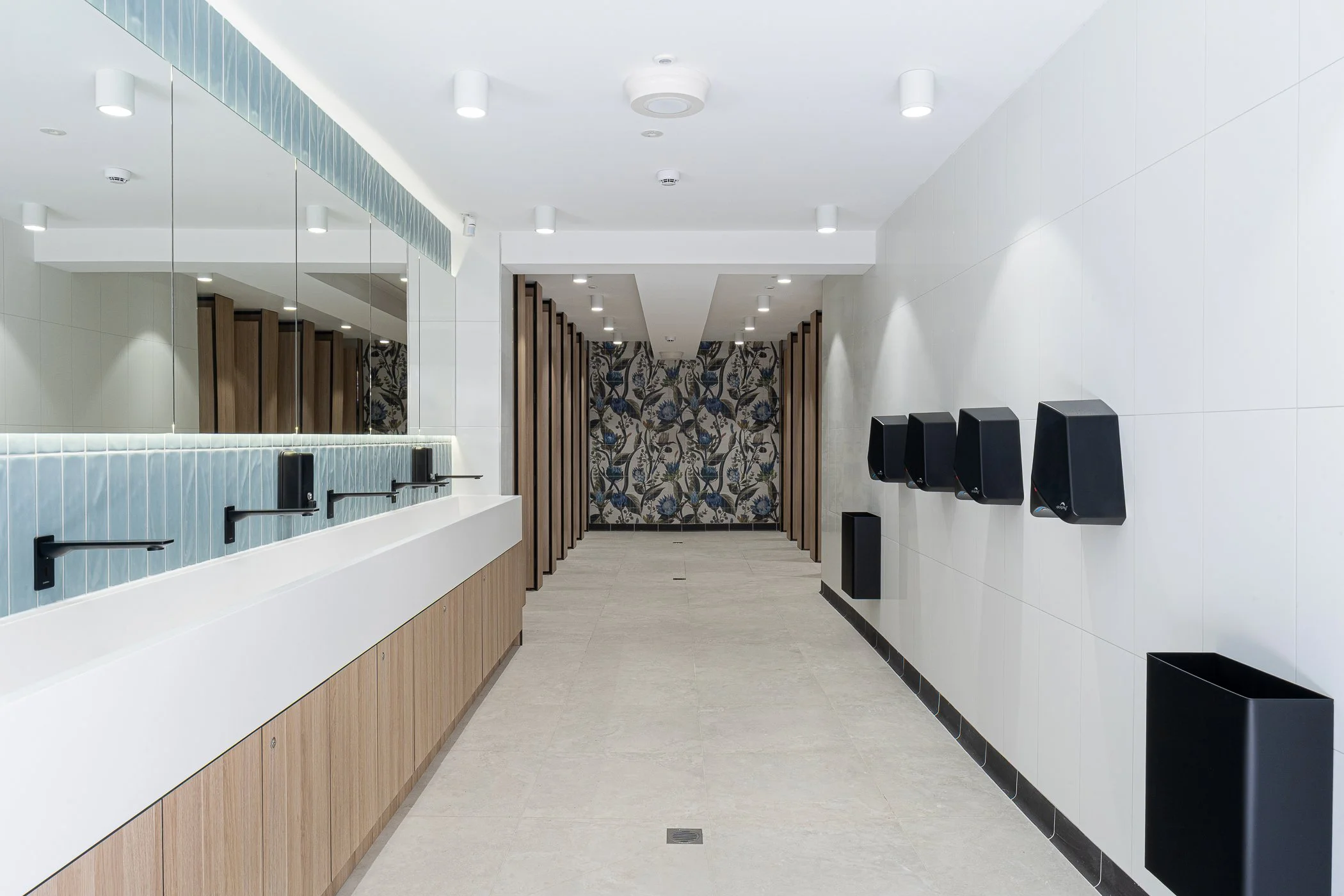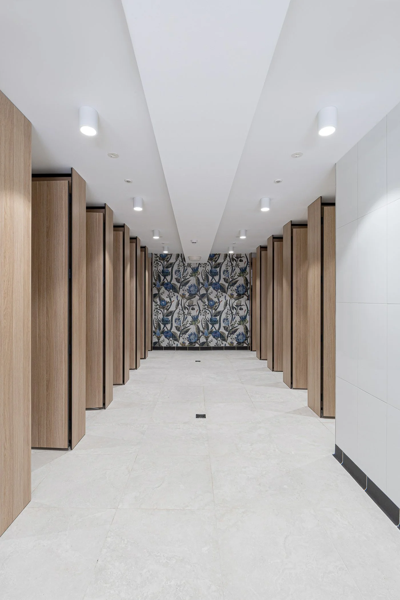 Every material was selected with both beauty and durability in mind. Commercial-grade fixtures, stainless steel taps and full-height partitions support long-term performance in a high-use setting.
