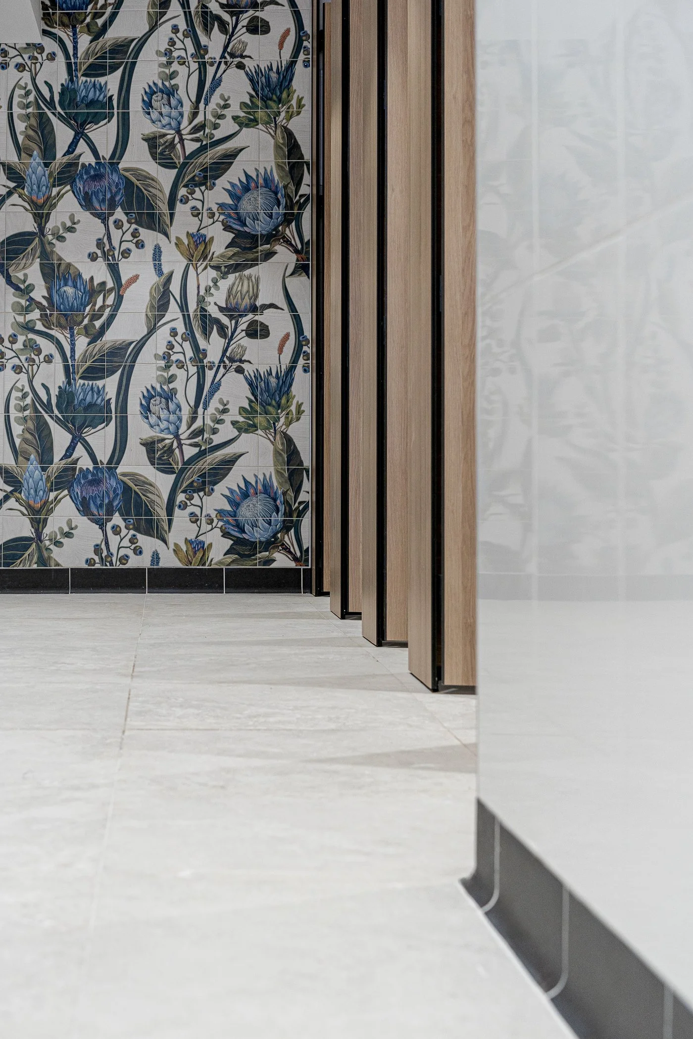 The design was inspired by the campus itself. A delicate floral motif embedded in the stained glass of a nearby building, along with the school’s established gardens, became the inspiration for a tiled feature wall: feminine, floral and distinctly St Ursula’s. Combined with natural finishes and colours, including natural oak and sage, the interior palette brings a sense of calm and wellbeing to a once-overlooked space.